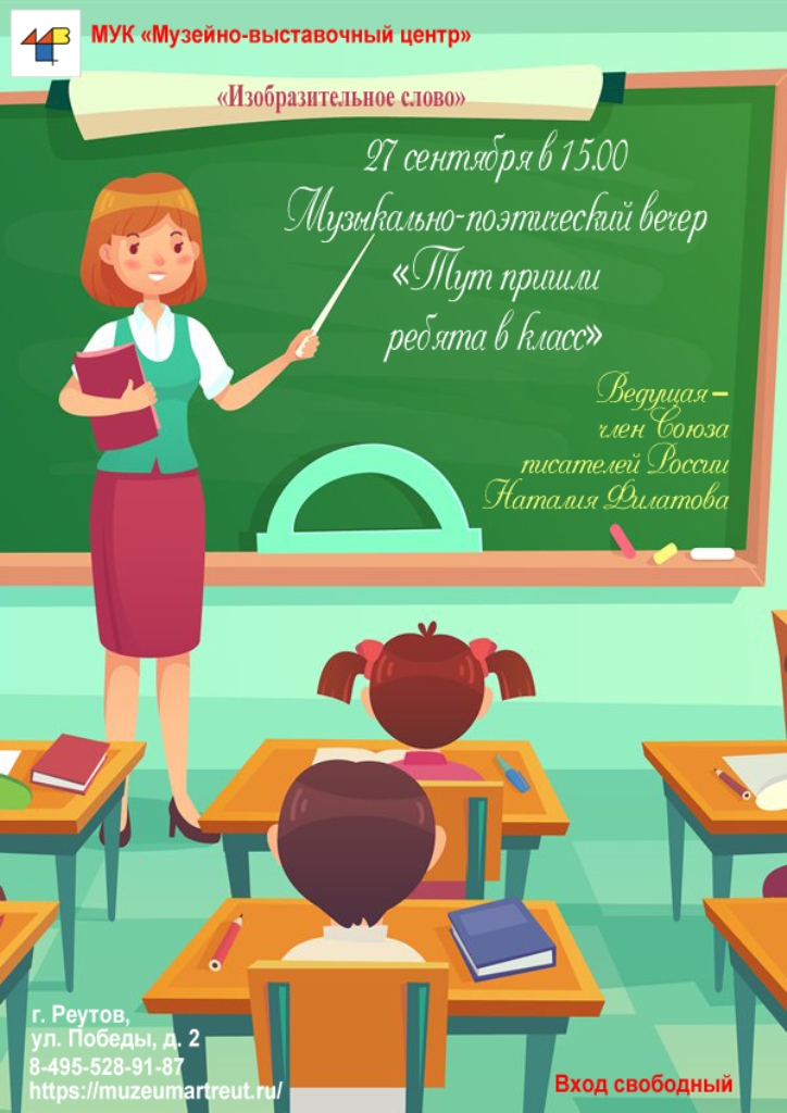Друзья! Музейно-выставочный центр приглашает 27 сентября в 15.00 на музыкально-поэтический вечер «Изобразительное слово», посвященный началу учебного года, Дню учителя, а также чарующему миру детской литературы и её вдохновенным авторам!