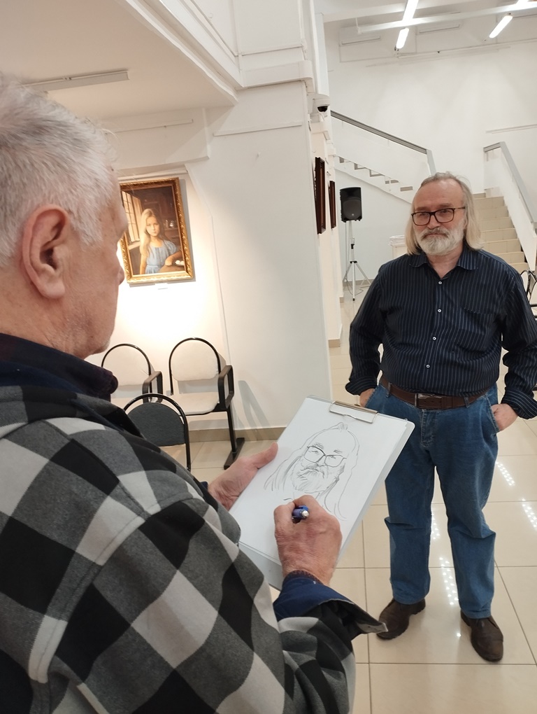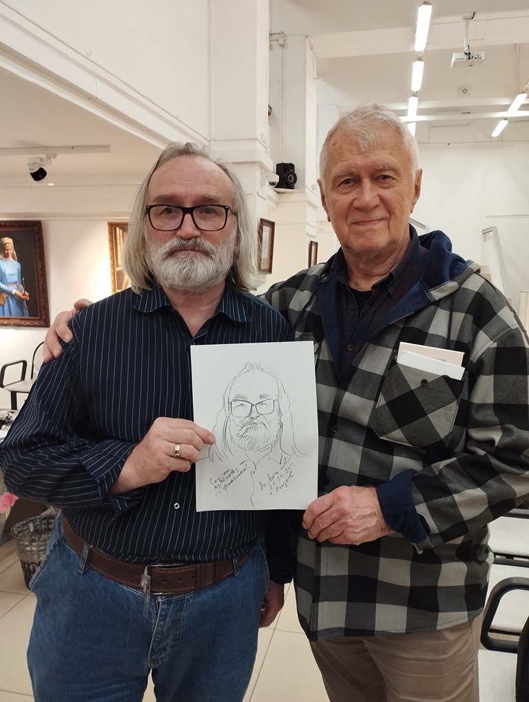 Интересно, что между мастер-классами Артемьева, в МВЦ приехал бывший главный художник журнала «Крокодил» Владимир Мочалов и сделал за несколько минут дружеский шарж на Артемьева.
